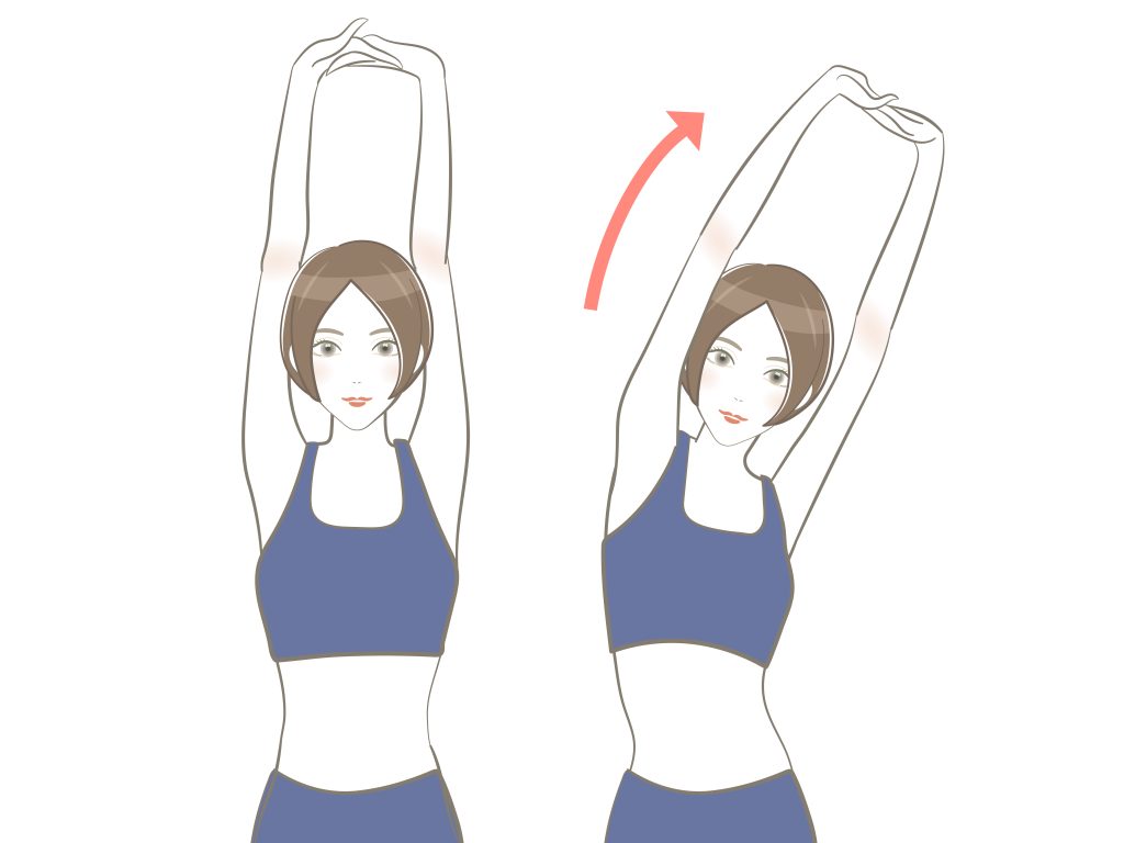 両手を頭の上にまっすぐ伸ばし、ゆっくりと背筋を天井に引き上げるようにストレッチ。
